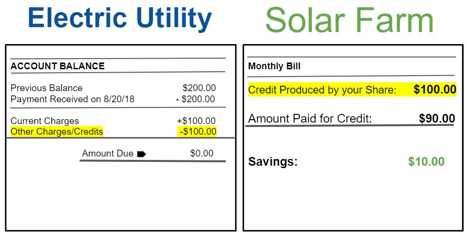 A: There is some variation depending on the utility you have and the farm you join. In general, a portion of the solar farm is reserved to produce for you. That reservation is sized according to your past energy usage. What your reservation produces is applied each month as a credit on your electric bill. The goal is to size the reservation to offset most or all of your electric bill. In most farms, the participant will receive a separate, discounted bill for what their share of the farm produced. It’s like having a “solar gift card” applied to your electric bill every month, and you always purchase the gift card for less than its value.